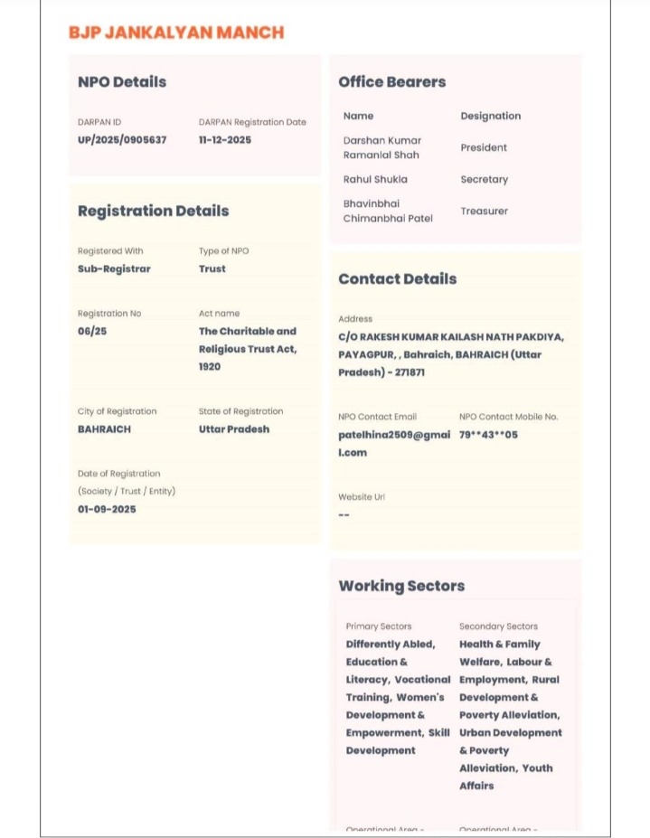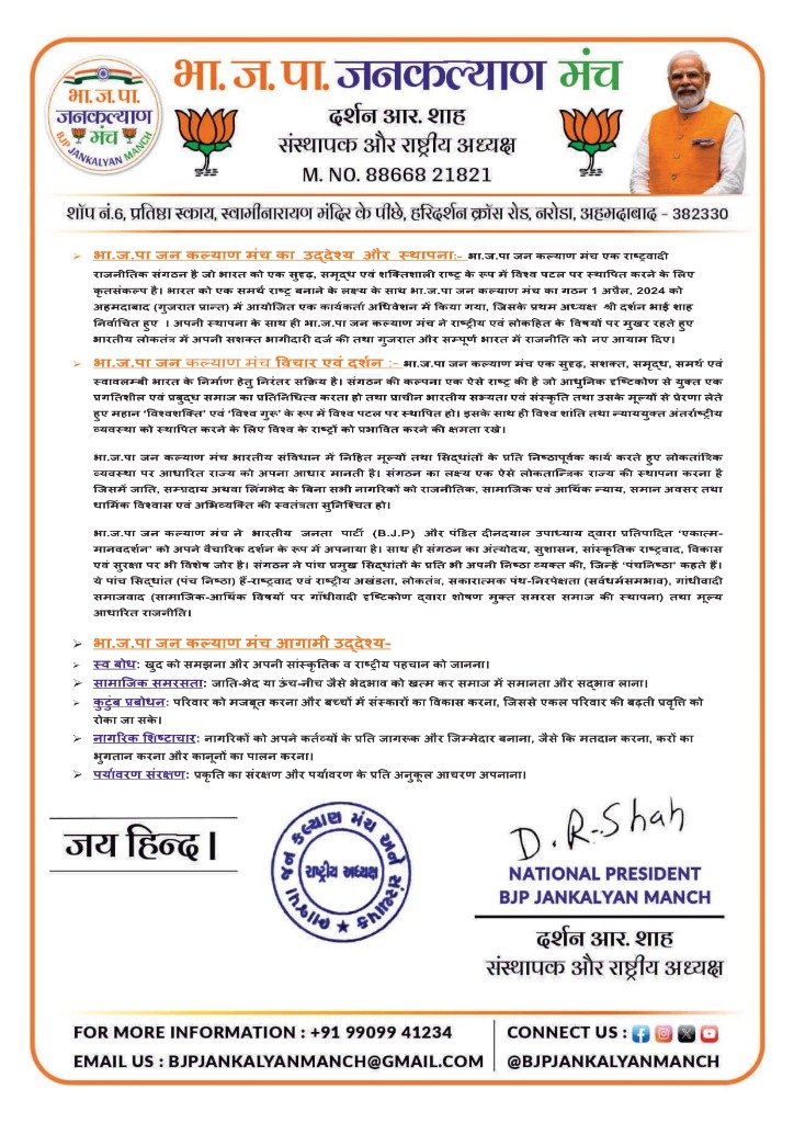 Darpan IDभा.ज.पा जन कल्याण मंच एक राष्ट्रवादी संगठन है जो भारत को एक शुद्ध, समृद्ध एवं शक्तिशाली राष्ट्र के रूप में स्थापित करने के लिए विभिन्न क्षेत्रों में कार्यरत रहता है। यह संगठन अपनी योजनाओं एवं कार्यक्रमों के निर्माण में केवल राष्ट्र निर्माण का ही ध्यान रखता है न कि जाति या धर्म का। इसका मुख्य लक्ष्य संगठन के माध्यम से हर क्षेत्र में भारतीयता की धारणा का विकास करना है।